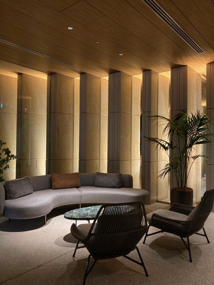 こじんまりのロビーエリア@北欧巨匠の照明がきらり。