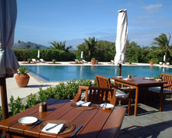 レストラン+オフィスなどがあるメインプール。だーっれも泳いでいません。 以前誰かのサイトで「子供達がプールの周りを走りまわり」とありましたが、あれは盆暮れ正月のことなのかしらん?レストランは1度だけ利用しました。(その他は全てルームサービス)お味は期待していなかったのですが(失礼!)、美味しかったですよ。少なくとも、私達の口にはあいました。白人のマネージャー(又はシェフ?)がいちいち一皿ずつの出来具合をたずねて周っていました。ハワイよりも数倍イケルと思います。 | |