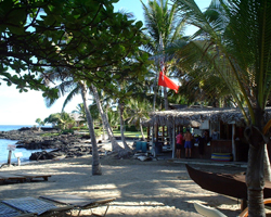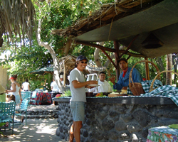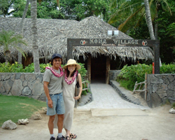 やってきました。ハワイでは珍しいタヒチアン風のリゾート、「コナビレッジ」。ここは何年振りでしょうか?以前と変わりの無いハワイ唯一のポリネシアン・リゾート健在だといいな。 レセプションの前にて。ちなみに、空港からの送迎は無料です。 | |