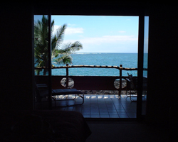 ラナイのコーナーからの眺め。朝も昼も素敵。でもサンセットタイムは特にやられてしまいます。まん丸の夕陽が真ん前にどっかーんですから。 | |