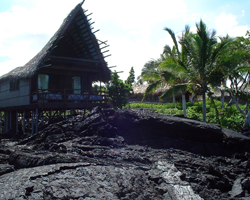 一番右端に見える三角屋根がハレです。溶岩が流れて固まりビーチになった様子がわかります。なかなかワイルドなセッティングでしょう? | |