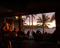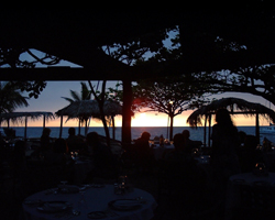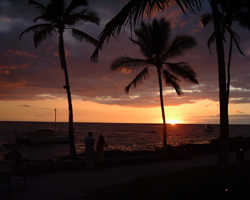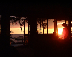 サモアレストランからの夕陽の眺め。うっとり。そうそうこのリゾートはハワイでは珍しく宿泊料金に三食が含まれています。夜のドレスコードは、女性はドレッシーなサンドレスにサンダル&男性は襟付きシャツ、長ズボン、サンダル以外のシューズです。※半ズボンの男性は、パレオを巻かれておりました。(^^;) | |