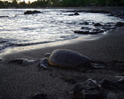 夜中ビーチで休んでいたカメ君が朝陽の頃に海に帰るところです。あそこにもここにも、カメカメカメ・・・。 | |