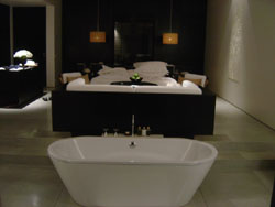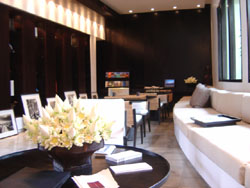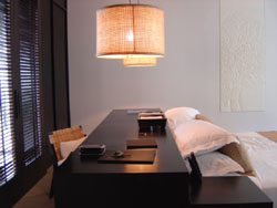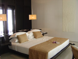 ふ~やっと到着。ハワイから超遠かったです。まずはお部屋にて、シャンペンで乾杯。 インテリア担当は、ご存知ケリー・ヒル氏。お写真で拝見すると、私の苦手なシンプル・モダンが際立っていたので不安でしたが、実際は落ち着けます。インテリアに興味の無いうちのオットにして、「写真よりいいじゃん。リラックスできるよ」とのことでしたが。※写真では真黒に見えますが、実際にはタイによくある茶&黒のミックスという感じでしょうか?
