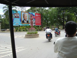 街中、シアヌーク殿下。 ・・・現在アンコールワットは建築ラッシュ。ざっと見ただけでも30軒あまりのホテル&数え切れないくらいのお土産やサン等が建設中でした。当然、ホテルマンを養成するスクールも大盛況とか。ホテルマンは憧れの職業のようで、なかなか倍率も高いそうです。次に訪れたときの驚き、今から想像できます。あらゆる意味でDeveroppingです。