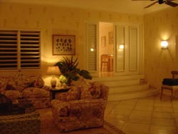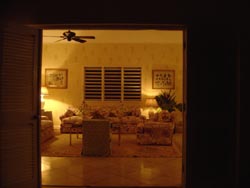うん、いい感じ。前のビラの半分くらいの敷地ですが、2人には十分ですわ。コの字型のプランは真ん中にリビング、両脇にそれぞれ一つずつラナイ、カウチ&テーブル、ベッドルームとバスルームの構成。レストランやフロントにも近くて、まとまりがあって明るくて軽やかで好きかも。(オットは少々不満?=「家具がチープ」とのこと)お互いに何処にいるのか見渡せるのが良いわ。びんぼーしょー?実はもっと素敵そうなビラも数軒ありましたが、既にオキュパイでした。この辺でよしとしましょう。初めてってことですしね?
