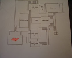 ビラのフロアープラン。3層になっており、真中にプール、その脇に2階建てのゲストルームが2棟4部屋、隅には調理場(おかかえのコック付き)、リビング・ダイニングの棟、サラ(東屋)があり、更に上にはオーナーの独立したビラがあります。これでも中くらいの大きさ。もっと豪邸もありました。ふ~皆さんすごいわ。 |