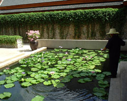 レセプション。常に100%の予約率を誇るアマンリゾート一人気のあるアマンプリ。私達の行った時は丁度バカンスとバカンスの中間で、人が少なくてラッキー。それでも、今まで行ったアマンの中では一番多く(ほとんど白人)の滞在客を見かけましたが。(日本人らしき人は4名だけ)「アマンは古いほど人気がある」と言われていますが、確かに言えてるかも。アマンプリはアマンダリに共通する「練れたスタッフ」という印象を受けました。 歩いていると、すぐにあちらから近寄ってきて「何かありますでしょうか?」と聞きにきます。 |