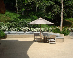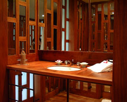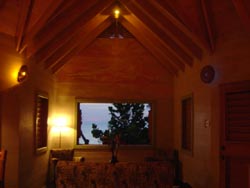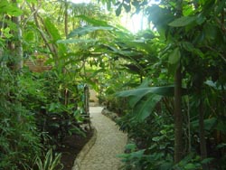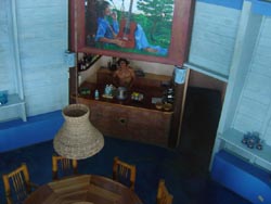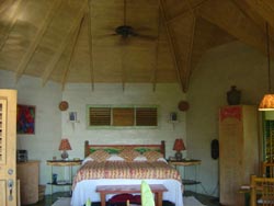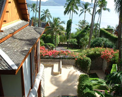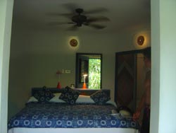 リビングの裏側の階段を上ると、更に独立した建物があり、オーナーが不在の時は貸し出すシステムになっています。 ビラには専属のスタッフが数人ついてくれるのですが、人を使い慣れていない私達にはとまどうことばかり。スーツケースの中身の整理はもとより、化粧バッグの中身までキチンと整理されていたり。うちのオットの脱ぎ捨てた下着とかもきれいにたたまれており、何というか、ちょっぴり恥ずかしかったりして。リビングで本を読んでると、さっとドリンクが運ばれたりして、オットいわく「何処からか見てるのかしらん?」・・・常に使用人がそばに居るのが慣れている人にとっては、いようがいまいが気にならないのでしょうけれど・・・。 |