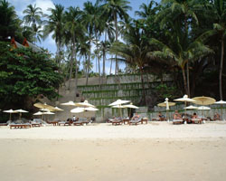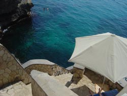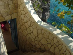ビーチからプール側を見たところ。断崖のよう。エド・タートル氏の建築デザインの原型というか、アマンのエッセンスが全て凝縮されているように思いました。アマンキラ、アマンダリ、アマヌサなど、かなりここからインスパイアされているのでは? 余談ながら上から見るとあまり透明度の無い海ですが、海中は豊潤そのもの。(オット談)スノーケルでも、カラフルな磯花や珊瑚などが楽しめます。 |