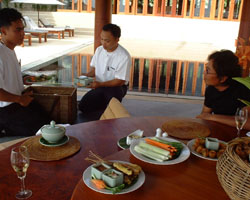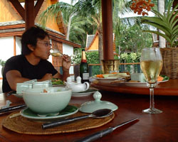 レストラン。タイ料理とイタリアンが中心。メニューはごく控えめに言って、とても少ないです。満室のわりには、常にお客様は2~3組。皆さん外に食事に出かけておりました。私達は早々に苦しくなってしまい、コンシェルジュのお薦めで市内にある有名ホテル「ラ・ムリア」等に行きました。ラ・ムリアはとても美味しくメニューの幅もありました。