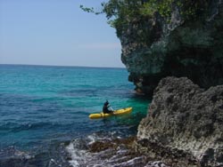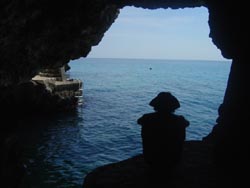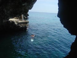 飛び込むと、洞窟と海に出ます。波が無くぴた~っとしていて透明度はばっちり。スノーケルにうってつけ。
