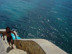 プライベートビーチに行くには、急な階段を下りて行かないといけません。なかなかドラマチックなのですが、酔っ払って転んだ人って今までいなかったのかしらん?アメリカの建築基準では絶対に許可がおりないだろうなぁ~などと思ったりして。 |