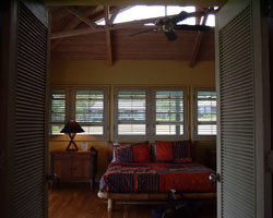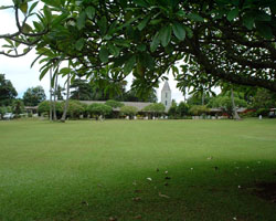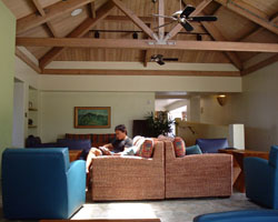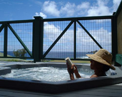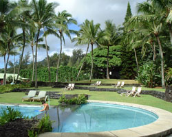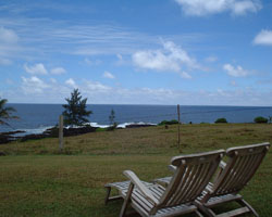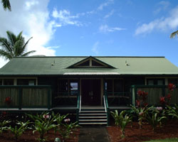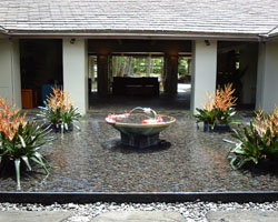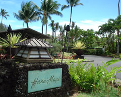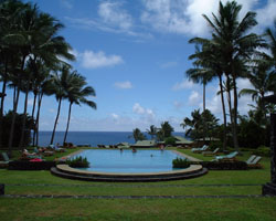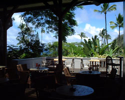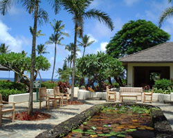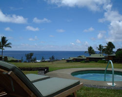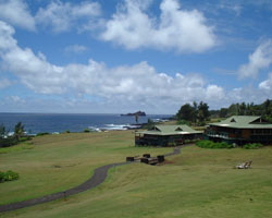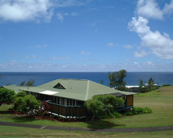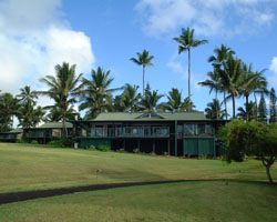 ビル・ゲイツ氏が結婚式を挙げたことで、一躍世界的に有名になった18番ホールの前のクラブハウスです。***実は1991年のオープン当時コエレとセットで宿泊する予定でした。が、超混雑時で見せてもらった「最後の一部屋」というのが、あまりにも気にいらないビューでしたので、その場でキャンセルして午後の便で急遽ホノルルに帰って来てしまったという過去があります。(^^;)ですから、今回もちょっぴり不安でした。10年前といえば、アメリカが好景気に沸きに沸いていたバブルの絶頂期。Kamaaina料金もなく、お部屋は満室でフロントのお姉さんもスノビッシュだった記憶があります。