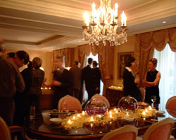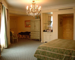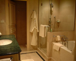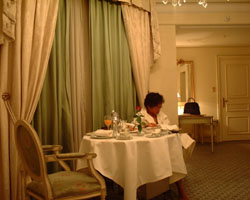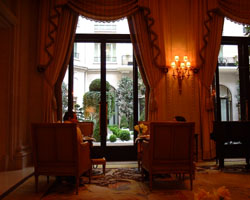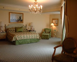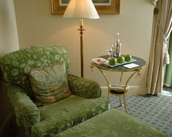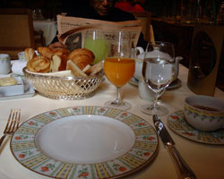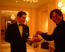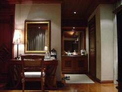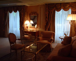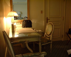 ウエルカム・フルーツ。奥は書斎。バトラーシステム完備で、ブザー一つで何でもしてくれます。が、しかし・・・人を使いなれていない私たちに必要無いかも?というのが、正直なところです。スーツケースの整理も自分でさっさとしてしまう人間に、バトラーさんってどう?(笑)エレベターを降りると、バトラーさんが小走りで私の部屋の前に行き、ドアを開けて電気をつけて待っていてくれました。下のショップで買い物をするとお店の方が、バトラーさんに取りに来させました。そういうシステムだそうです。大変恐縮しました。(^^;)とにかく、チップをどっさり用意いたしましょう。