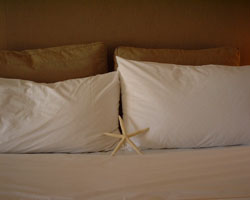 ターンダウン後。ベッドに関しては一応、一過言ありなんで、寝心地に少々問題ありというのが正直な感想です。我が家のヘブンリー・ベッドが恋しく、思わずプラウドしてしまいました。えらそーですみません。ちなみに泊まり歩いたハワイの