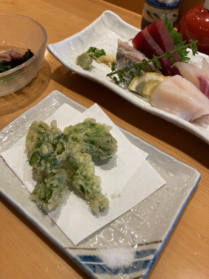 アテ:菜の花の天ぷら・ホタルイカなど。